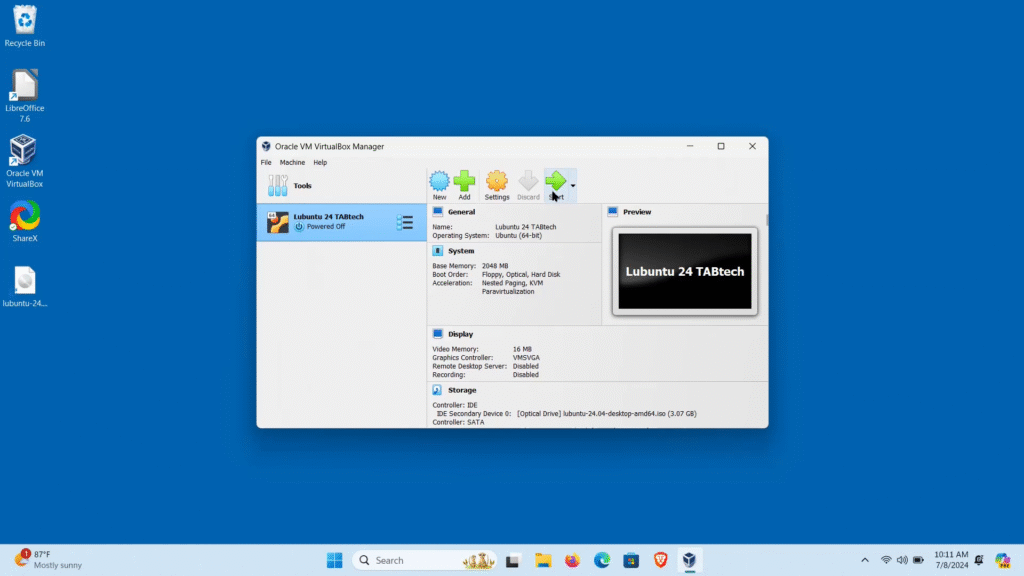 I configured the hardware virtualization to mimic a system roughly half as powerful as my computer which is still more than enough to comfortably handle Lubuntu.